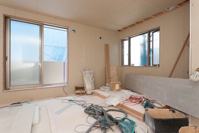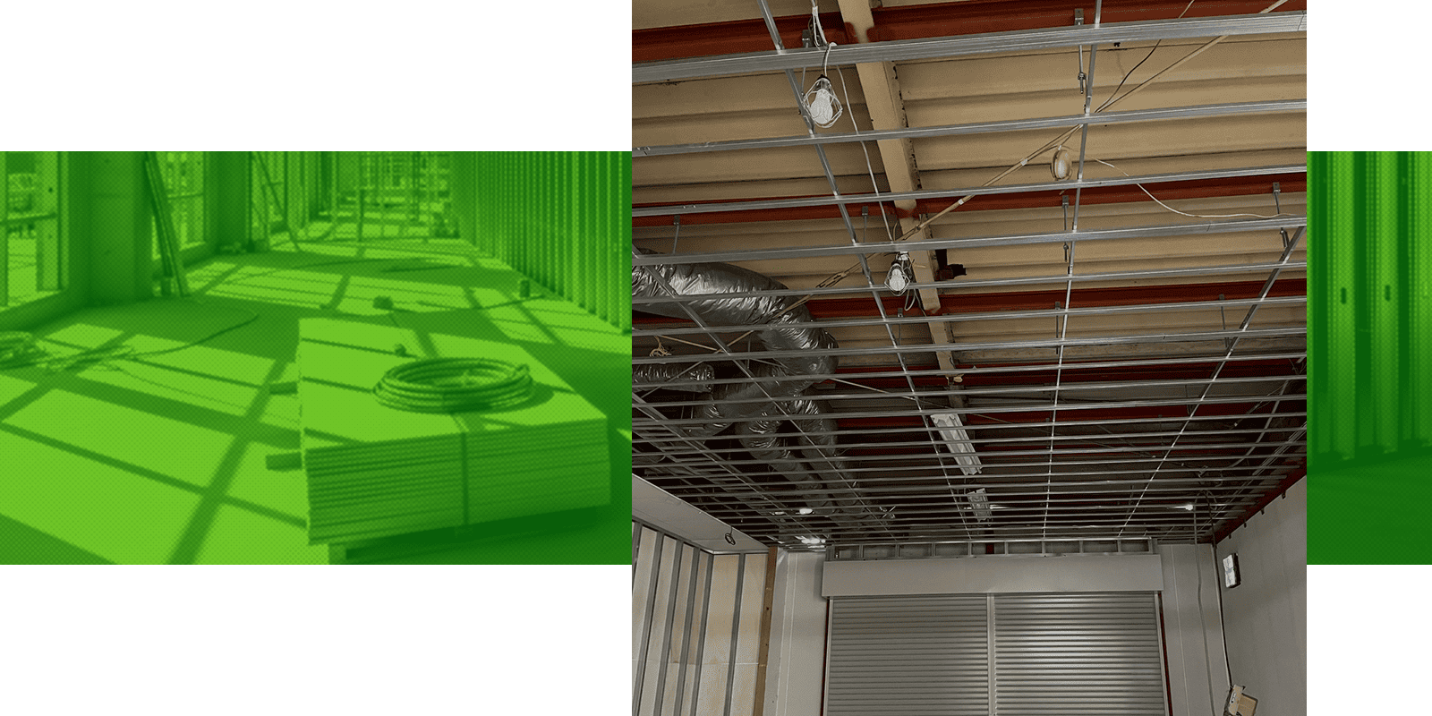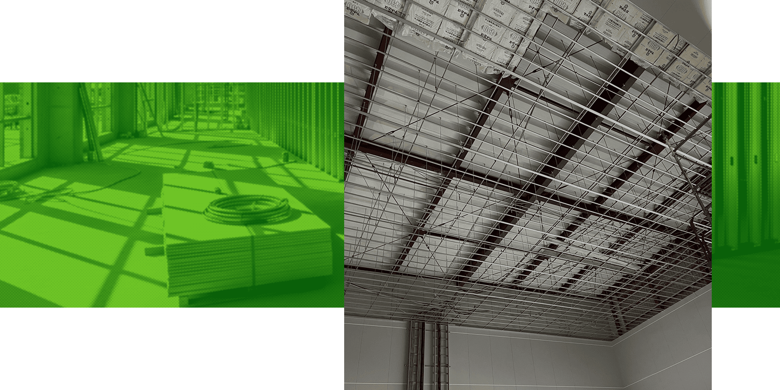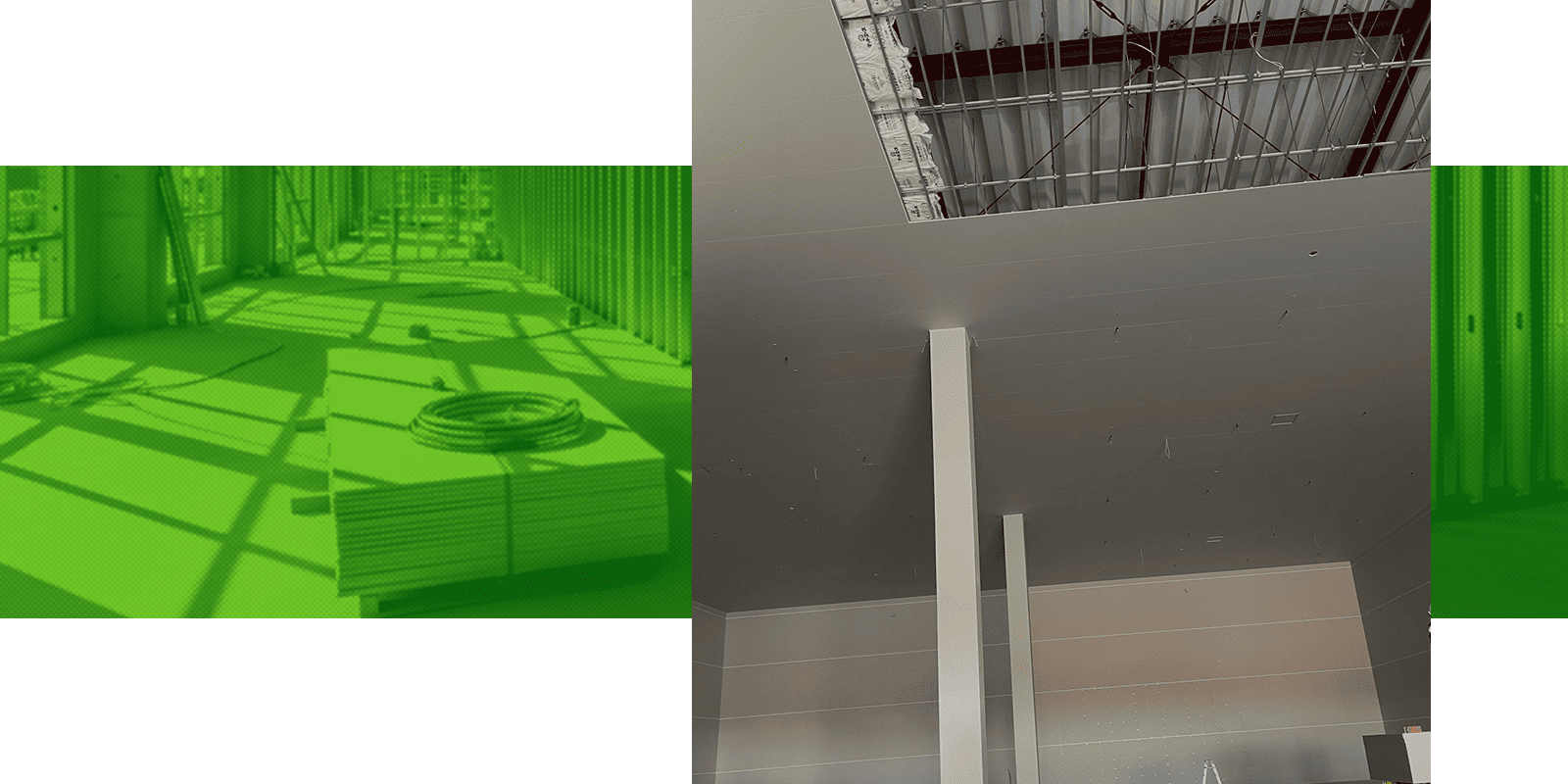 石膏ボードを下地に貼り付けて壁・天井の面をつくる、軽天工事の仕上がりの美しさが問われる工程。