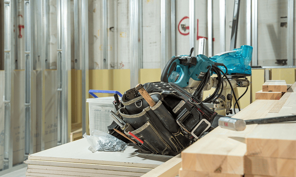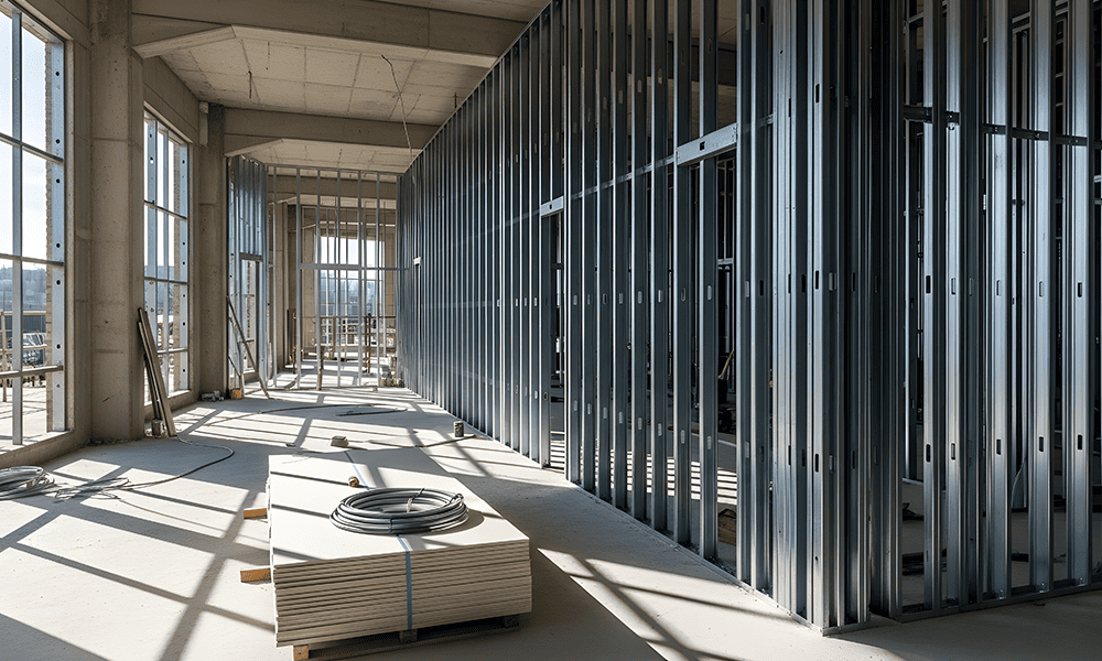 壁・天井の骨組みを軽量鉄骨で組み立てる、内装工事の要となる下地工程。